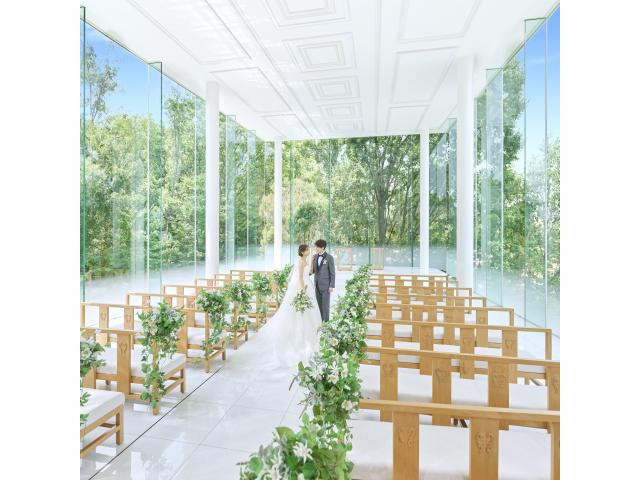【美しい緑に囲まれた3面ガラス張りのチャペル】天候に左右されず、屋内にありながらも美しい緑と陽光に包まれたチャペルで、感動に満ちた一時を過ごそう。大切な挙式入場シーンを体感。感動のムービー演出体験も