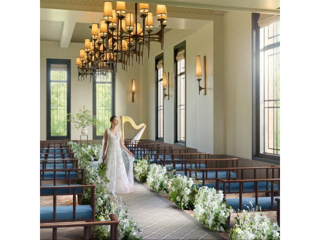 【日本の美しいチャペル100選受賞】17mのバージンロードとクラシック感が魅力の館内チャペルと大阪城や緑が望める開放感が人気テラスチャペルの両方見学できる(ご参加のお2人を、1組ずつ挙式体験へご案内)