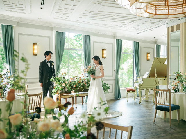 [パーティ会場見学]窓から差し込む自然光と緑が心地よい会場。天井には円形のシャンデリアが施され、世界に3台しかないチェコ製アンティークピアノが置かれたクラシカルで上質なパーティ空間を堪能いただけます。