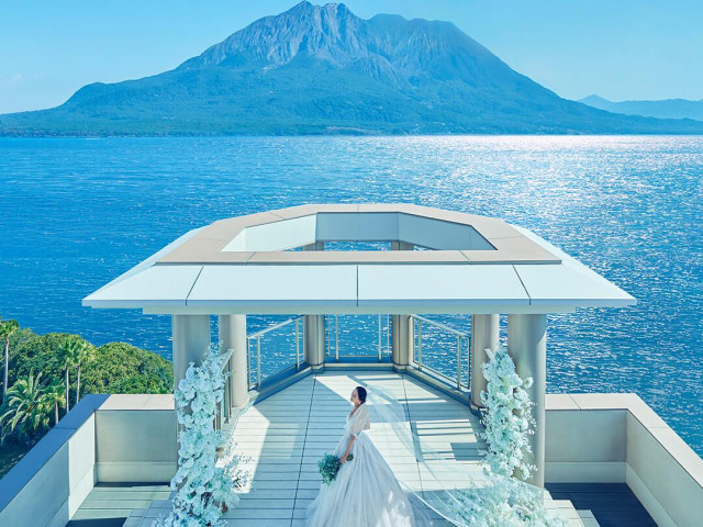 目の前に桜島を望む海辺に佇む『グランドハウス』。沢山の窓を配した印象的な建築デザインは豪華客船がモチーフ。そこには、ふたりの人生の素晴らしい船出への願いが込められています。