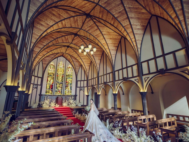 [旅立ちが挙式のコンセプト]ふたりの人生の門出を出航になぞらえ、「旅立ち」をコンセプトにした大聖堂挙式。ふたりの誓いを見守るのは、キリストの「復刻」が描かれた100年の時を刻むステンドグラス。