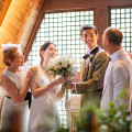 森音の教会(人前式)木のぬくもりに溢れた三角屋根の独立型チャペル。 挙式料には、司会者、生演奏(チェロ・オルガン)、聖歌隊、チャペル内装花が含まれています。収容人数80名 ※キリスト式はプラス5万円で選択可。
