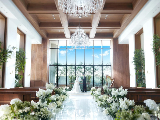 本番さながらの模擬挙式を体験!自然光に包まれたチャペルでの入場体験では感動で思わず涙する先輩花嫁も。窓枠も大きく天井高7mと会場全体が開放的。お二人の未来を祝福するような大きなシャンデリアが輝きます。
