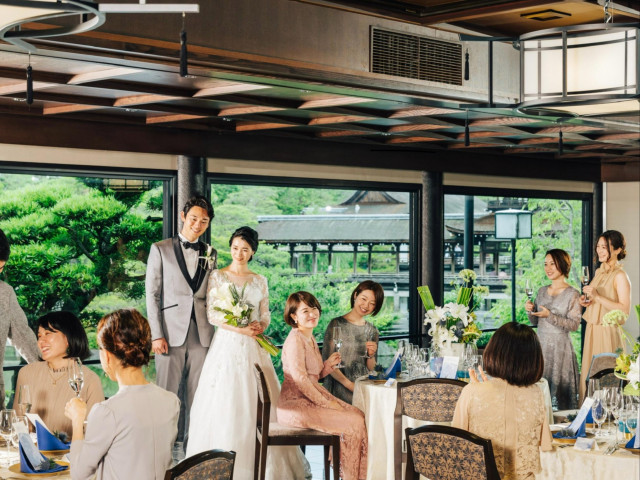 | おすすめ ポイント | 平安神宮の境内に併設された祝宴会場「迎賓殿」。名勝指定庭園「神苑」を一望でき、窓の向うの自然の景色と純和風の設えが調和する。移動の心配がなく、設備も充実しているのでどんなゲストを招いても安心