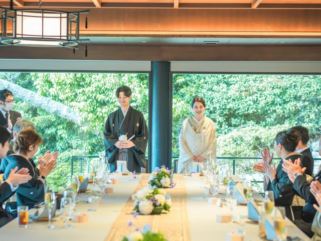 神前式後も移動負担なく徒歩1分で披露宴会場に行っていただけるので安心。1万坪庭園が窓から一望でき、ご家族やご親族との会話もアットホームに弾む、あたたかい少人数ウエディングを。