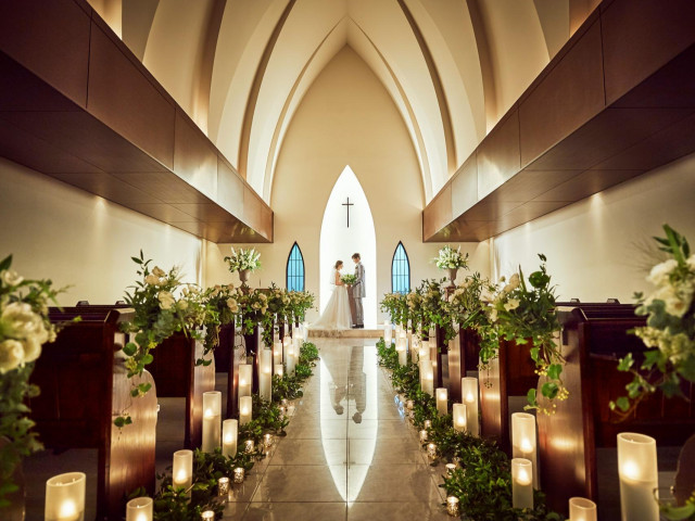 おすすめ ポイント | 天井高13mと開放感あふれる教会では、絆が感じられるこだわりの挙式が人気 |