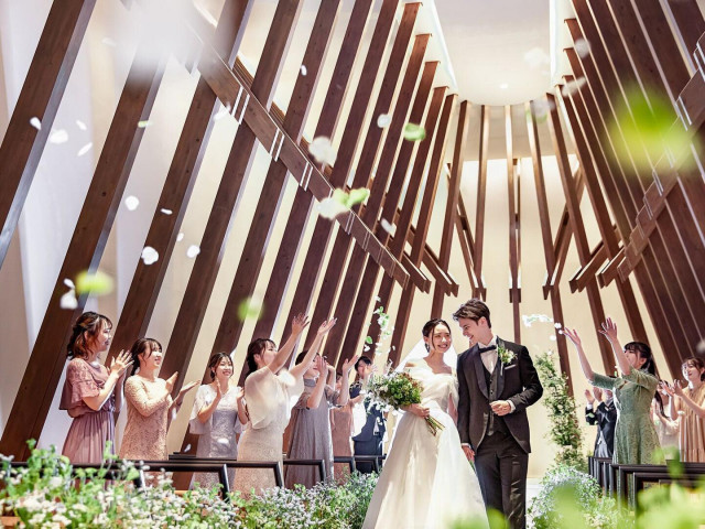 森の木々に包み込まれたデザインのチャペル「GROVE」森の木漏れ日を感じながら行う優しい挙式を体感♪生演奏と聖歌隊が祝福する感動を。