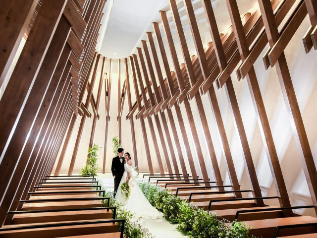 森の木々に包み込まれたデザインのチャペル「GROVE」森の木漏れ日を感じながら行う優しい挙式を体感♪生演奏と聖歌隊が祝福する感動を。※~120名まで収容可能