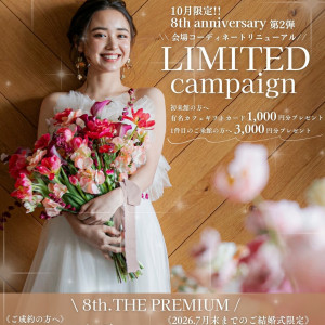 2025年10月1日から2025年10月31日までに初めてのご来館の方限定 会場使用費50%OFF+ご新婦様2点目ドレス20万円OFF 最大36万円OFF!!