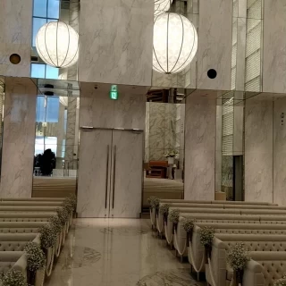 白を基調としたチャペルは、天井はとても高く、壁には水が流れており、とても幻想的な空間で息を呑みました。高層階なのでガラス張りになっている部分からみえる大阪の景色も映えていました。窓側が全面ガラス張りでusjと夜景が一望できるようになっていました。また、そのガラス張りの窓はスクリーンにもなっており、映像演出の際は映画館のような大画面で映像を見ることができました。他の会場と比べても平均的かと感じましたデザートがとても見た目にも美味しいプレートで印象的でした。usjのすぐ近くで、非日常的な空気感のある立地は個人的には良いと思いました。案内もスムーズで、見積もりも私たちの好みに合わせて考慮したものを数パターン作ってくださいました。また、見学当日の日も私たちの名前のアイテムを用意してくれていたりホスピタリティを感じました。挙式前のウェルカムスペースがお洒落なバーのようになっておりお酒も飲めて素敵でしたお洒落な雰囲気や、チャペルにこだわるカップルにおすすめです。詳細を見る (431文字)