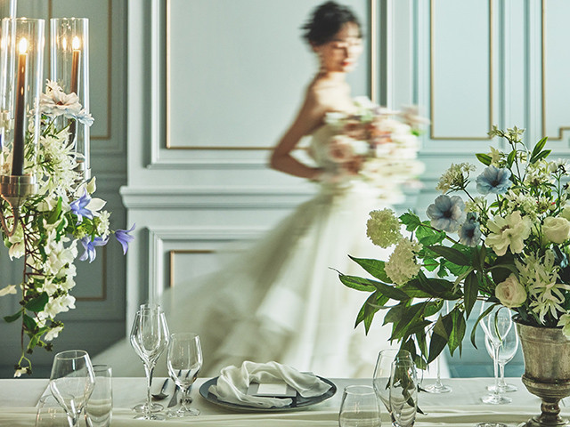 キリスト教式、神前式、人前式に対応できるシンプルモダンな空間デザインは、和装・洋装のどちらにも似合います。会場コーディネート展示