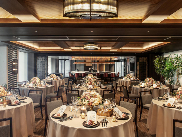 木の温もり溢れる落ち着いた雰囲気の会場はそのままでもおしゃれと人気。行き来自由なバーカウンターや五感でお料理を楽しめるオープンキッチンなど、ゲストをもてなすための要素が満載の会場は要チェック。