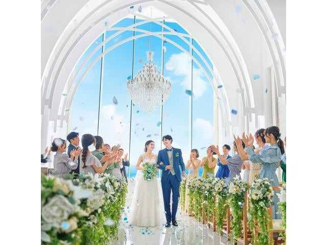【海の絶景ロケーション】自然光降り注ぐチャペルで入場体験!ハープ・バイオリンの生演奏とゲスト全員に見守られる感動のチャペル。海のリゾートならではの雰囲気をお楽しみください※100名着席可能