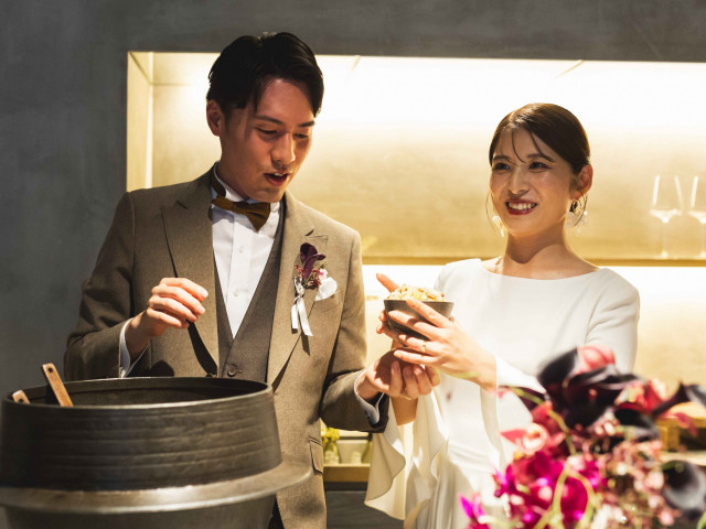 本当に美味しいものは街にある。IWAIのシェフは婚礼料理出身者ではなく、「美味しい!」という声を目の前で生み出してきた街場のレストラン出身者にこだわりました。こだわりのコース料理より、一品をご提供いたします。