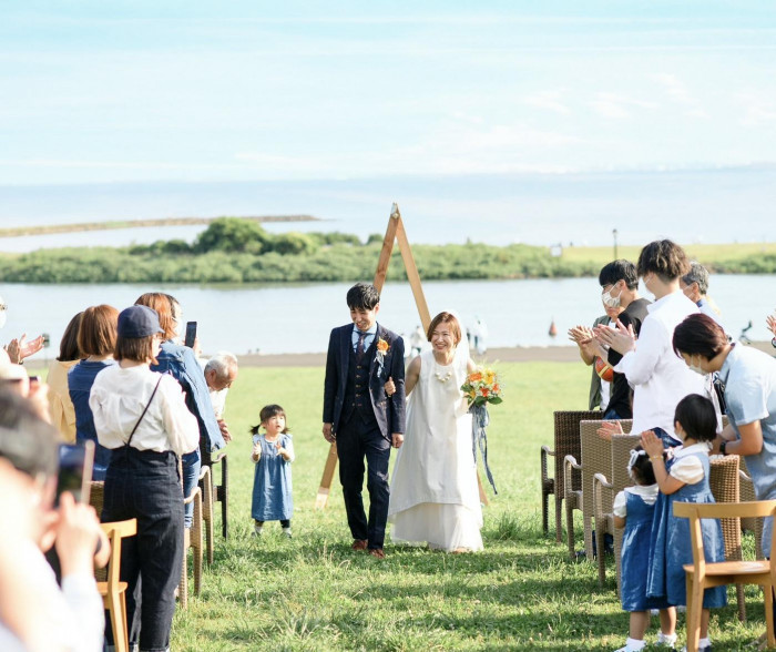 挙式会場は海が見えるロケーションと、森の中でプライベートな空間を重視する二つの挙式会場がありますが、私たちは海が見えるロケーションでの挙式をしました。天気が良ければとても綺麗な景色と写真が撮れます。公共施設内での挙式になるので、一般のお客様もいますが、式当日は、遊びに来ているお客さんにもおめでとうと温かい言葉をもらえます。挙式中は、ゲストの方々との距離も近いので、アットホームな雰囲気で気を張らずに挙式をすることができました。披露宴会場はウッドデッキがある場所で、雨天対応のテントになっていました。披露宴会場の大きさはゲストを何名呼ぶのかにもよるかと思いますが、私達は41名でしたが、広さに余裕はあったかなと思います。また、披露宴会場の近くにはテントがいくつか設置されており、お子様がいらっしゃる場合にはキッズテントもあり、配慮がされていると感じました。葛西臨海公園駅から会場までは、とてもわかりやすく、アクセスしやすいかと思います。また、公園内ですので、挙式が始まる前に散策する時間もありますし、海が見える場所なのでとてもロケーションは素敵なところでした。私たちの結婚式ではお子様が4名で、披露宴会場付近にキッズテントが設置されていたので、子供達も喜んでいたのでとても助かりました。結婚式準備では、自分たちがどのような挙式、披露宴にしたいのかを明白にすることが一番大事だと思います。自分たちのオリジナルの式ができる会場なので、プランナーさんと話し合いを重ねて、わからないことや不安な点はしっかり話し合うことで、当日楽しめるかどうか決まるかなと思います。詳細を見る (678文字)