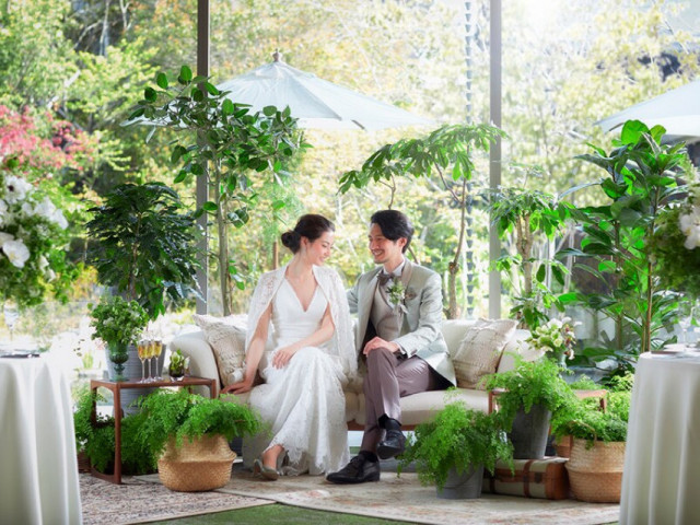 365日一日たりとも同じ景色の無いお庭を眺めながら過ごす披露宴会場は、ゲストの方がゆったりとお過ごしいただけるおもてなしの空間!結婚式当日をイメージしていただける入場体験も人気!