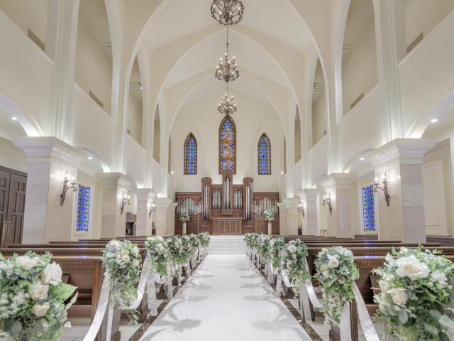 | おすすめ ポイント | 白基調のスタイリッシュな大聖堂、 広く長いバージンロードは当日お召しになるドレスをより綺麗に見せてくれます。 |