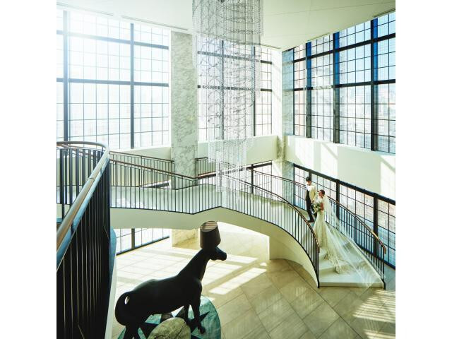 【どこを切り取っても絵になる当館】各会場はもちろん、ロビーにもこだわりのある当館。ゲストが楽しく歓談できるよう最初に通るロビーはとても広く開放的で、バーカウンターも設置。多くの種類のドリンクが提供可能