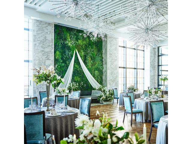 | おすすめ ポイント | 岡山駅から8分という好立地ながら、自然光と緑を感じられるパーティーフロア メインテーブル後方のグリーンウォールは圧巻の一言