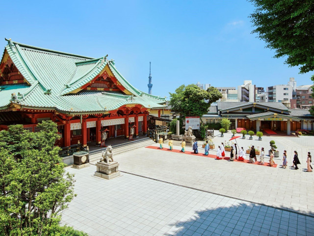 【東京駅・上野駅より車で10分】JR・丸ノ内線・千代田線の各最寄り駅から徒歩5分の好立地。タクシーやお車でも正面玄関前まで入ることができるため、遠方ゲストも安心。境内には最大20台の駐車場が完備