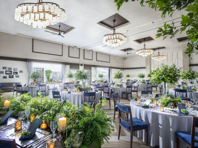 パーティ会場は、木目調のインテリアでアットホームの雰囲気の中リラックスしたパーティが叶う。オープンキッチンや大型スクリーン、隣接のホワイエなど注目して会場クルージングを