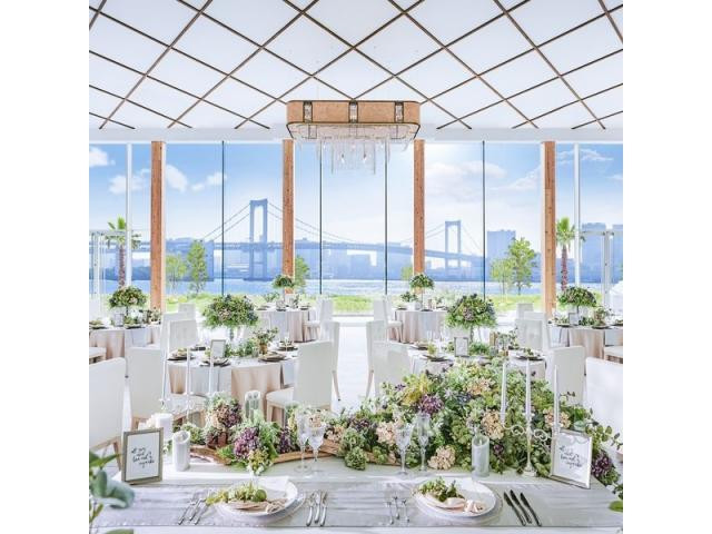 【東京湾の絶景に彩られる最高のロケーション】天井が高く、ガーデン、オーシャンビューが目の前に広がる開放的な会場は、ナチュラルも夜景とマッチする大人なコーディネート…様々なスタイルに合う♪お二人のお気に入りのコーディネートを見つけてみて♪