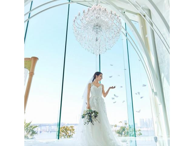 【絶景オーシャンビューと天使の羽が舞い落ちる天空チャペル】天井高のあるチャペルから舞い落ちる天使の羽や感動伝わるムービー演出の体験が叶う★海とガーデンに囲まれた貸切ガーデン挙式は東京でここだけ♪