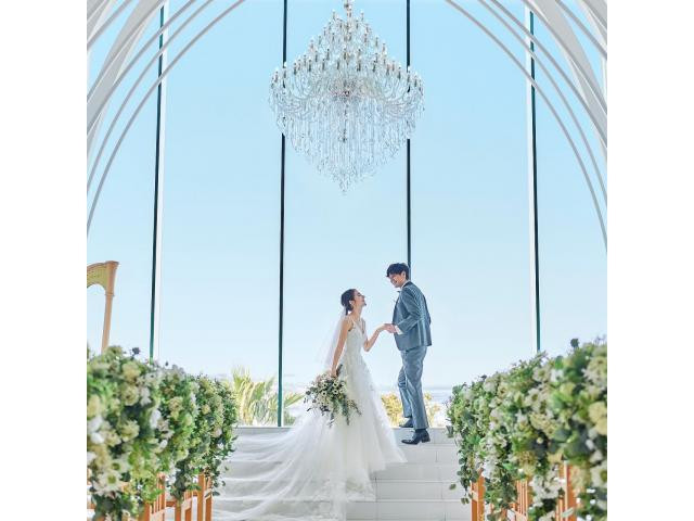 【絶景オーシャンビューと美しい緑が彩る天空チャペル】選べる挙式スタイル♪バージンロード15m、天井高10mの天空チャペルで感動セレモニー&ムービー演出体験。貸切ガーデンでの笑顔あふれる人前式も人気♪