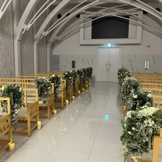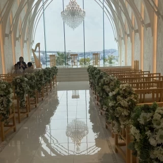 扉が開いた瞬間、本当にチャペルが綺麗で見惚れてしまう階段入場もテラスからの入場もできるしシェフの方のファイヤーパーフォーマンスもあるみたいです!デザートビュッフェもあるみたいなので参列する方に喜ばれるんじゃないかなと思います!!専用駐車場がないのが少し残念だけど、周りの景色はとても綺麗だなと思います!!道路渋滞で式場見学の際に到着が遅れてしまったのにも関わらず嫌な顔せず丁寧に対応して頂いて、最寄りのパーキングから見える位置で立って到着を待っていてくれました。ララシャンス内に向かう際には日傘を用意してくださっていてとても親切なプランナーさんでとても好印象でした!!チャペルがとても綺麗だし光の入り方も雰囲気が出ていて本当におすすめです!羽の降る演出もとても綺麗だと思います!チャペルや景色にこだわる方にはぜひお勧めしたい式場です!詳細を見る (367文字)