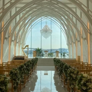 天井が高く、白基調のチャペル。巨大なシャンデリアとバックにうつる海が最高のロケーションです。挙式会場同様に天井が高く、2階から登場できる階段も魅力的です。一面ガラスの為外の景色も楽しめそうです。比較的金額が高めな印象ですが、人数アップ特典が多数あるため大人数だとお得です。アクセスは最寄りから歩きますが、参列者は送迎バスがあるため寧ろ行きやすい印象です。式場周りは何もないですがその代わりに遮るものがなく、景色が抜群です。挙式会場の特大シャンデリア、ナイトウエディングに最高の景色、リゾート感ドレスの持ち込みは有料の為、こだわりが強い人は要注意です。演出は自由がきくので色々やってみたい人にオススメです。詳細を見る (302文字)