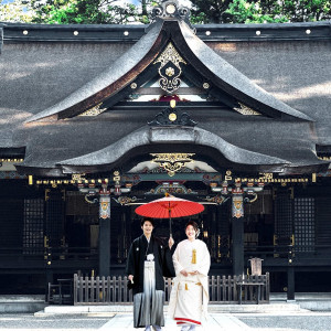 パワースポットとしても人気が高まる香取神宮。鳥居の朱と自然溢れる緑に白無垢のコントラストが美しく映えます。緑に包まれた社で神聖なセレモニーが叶う香取神宮挙式。家族の結びつきをより深く感じる一日に。