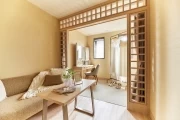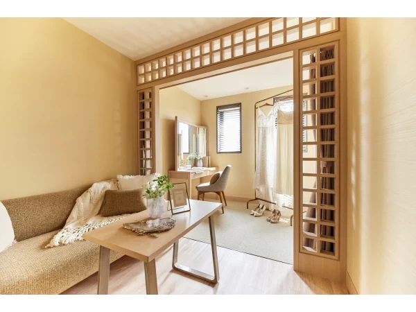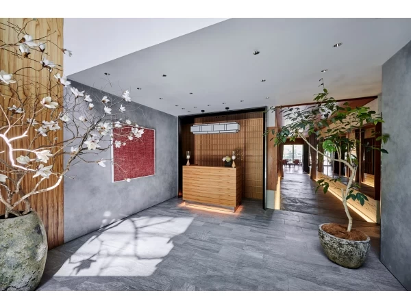 白を基調にした明るく上品な空間は、格子を彷彿とする直線的なデザインと温かみある自然の色合いや質感が調和する雰囲気です。