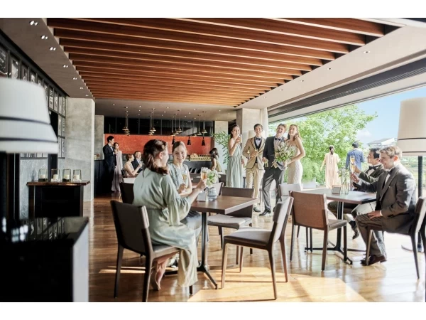 1階待合ラウンジからは、鴨川の煌めく水面や京都の街並みを望める自然を感じる空間です。ドリンクを楽しみながら、挙式までの時間もゆっくりとお過ごしいただけます。