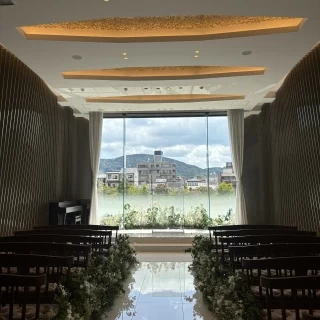 | おすすめ ポイント | 鴨川イメージしてデザインされたチャペルは、シンプルで落ち着いた空間です。祭壇から差し込む自然光が、壁面に反射し鴨川の煌めく水面を表現しています。 |