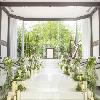 おすすめ ポイント | 大きな窓から自然光が差し込み緑溢れるリゾートチャペル。オリジナルバージンロード&ハープの音色が温かく包み込み感動的な挙式が叶う |