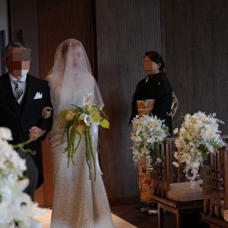 16メートルを超えるバージンロードを進むと、吹き抜けの天井まで伸びるグリーンウォールの祭壇。大理石の床におふたりの姿が美しく映えます。昼間の挙式はもちろん、幻想的な色合いに染まる夕暮れどきのセレモニーも印象的です。
