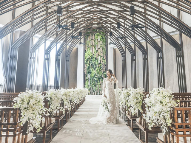 【自然のぬくもりが溢れる大聖堂】市内最大規模を誇り、高さ6.2mのグリーンウォールの祭壇が象徴的な「ルヴェール教会」。天候に左右されず、屋内にありながらも美しい緑と陽光に包まれたチャペルで、感動に満ちた一時を。
