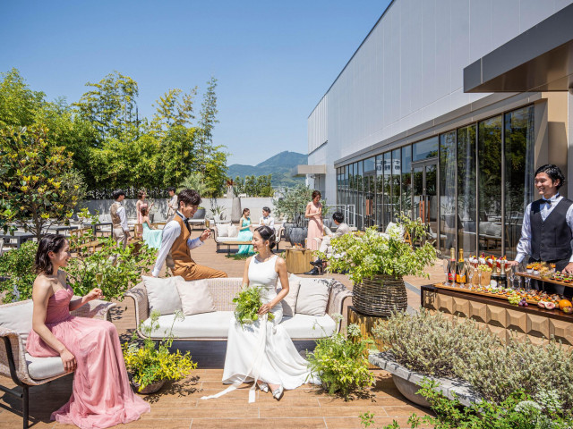 | ガーデン演出 | 有り青空の下で緑や風を感じられるガーデンでは、ゲストもふたりもリラックスムード。アットホームなウエディングにピッタリ。 |