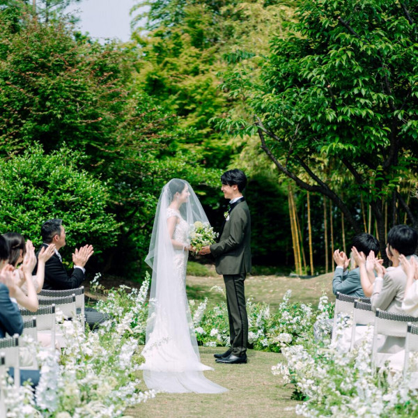 | ガーデン演出 | 有り青空の下で緑や風を感じられるガーデンでは、ゲストもふたりもリラックスムード。アットホームなウエディングにピッタリ。 |