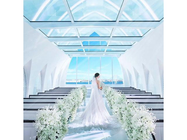 【みなとみらいの海・ベイブリッジを独占できる絶景の最上階チャペル】2万粒以上ものスワロフスキーの輝きと透明感のあり光溢れる青空のもとクリスタルチャペルで感動の挙式体験を。