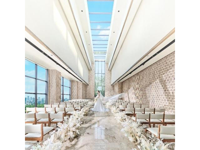 【自然光×眺望が魅力】天井高10m、高層階ならではの絶景が広がる開放的なチャペルでの入場体験。9:00フェアのみ外国人シンガーによる生歌演出もご体験頂けます※当日の結婚式により変更の可能性あり