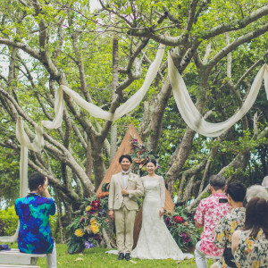 大きなガジュマルの木に装飾を施してくれて、リゾート挙式らしい素敵な雰囲気でした。当日はとても日差しが強く、直射日光が厳しかったですが、たくさんの木々からの木漏れ日が日差しを和らげてくれ、風が吹けば多少涼しく感じられました。親族のみのパーティでしたが、貸し切り状態で楽しく食事が出来ました。大きな窓に囲まれていたので、外に見える自然や日の光がとても素晴らしかったです。新婦ヘア&メイクを付き添い1へアップグレード、ブーケのアップグレード、撮影プランに2ヶ所のロケーション撮影を追加特典プランとして6名分のコース料理をつけてくれた点、衣装が選び放題な点はかなり費用を抑えられました。会場装飾を自分達で用意したので、オプション価格より安く用意する事がら出来ました。沖縄の食材を使った料理は全てとても美味しく、見た目も華やかでした。参列者にキッズがいたのですが、好き嫌いの食材も柔軟に対応して下さり、とても喜んでくれていました。リゾートホテルの敷地内ということもあり、挙式会場やロケーション撮影などリゾート感溢れる会場雰囲気でした。打ち合わせや相談は全てメールやzoomでのやり取りでしたが、聞きたいことは全て具体的に分かりやすく説明してくれました。挙式当日はパーティまでの付き添いメイクプランにしてもらいましたが、汗やメイク直しは必須だったので、付き添いにしてもらって正解でした。なんといっても挙式会場のガジュマルの木が良い!装飾も綺麗にして頂き、素晴らしい会場でした。挙式に必要なものを郵送して預かってくれたので当日は荷物も少なく臨めましたが、挙式後のたくさんの荷物を持ち帰るのは大変でした。詳細を見る (694文字)