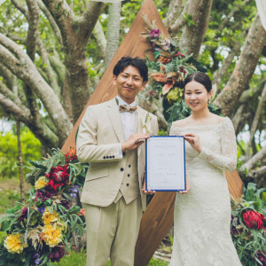 大きなガジュマルの木に装飾を施してくれて、リゾート挙式らしい素敵な雰囲気でした。当日はとても日差しが強く、直射日光が厳しかったですが、たくさんの木々からの木漏れ日が日差しを和らげてくれ、風が吹けば多少涼しく感じられました。親族のみのパーティでしたが、貸し切り状態で楽しく食事が出来ました。大きな窓に囲まれていたので、外に見える自然や日の光がとても素晴らしかったです。新婦ヘア&メイクを付き添い1へアップグレード、ブーケのアップグレード、撮影プランに2ヶ所のロケーション撮影を追加特典プランとして6名分のコース料理をつけてくれた点、衣装が選び放題な点はかなり費用を抑えられました。会場装飾を自分達で用意したので、オプション価格より安く用意する事がら出来ました。沖縄の食材を使った料理は全てとても美味しく、見た目も華やかでした。参列者にキッズがいたのですが、好き嫌いの食材も柔軟に対応して下さり、とても喜んでくれていました。リゾートホテルの敷地内ということもあり、挙式会場やロケーション撮影などリゾート感溢れる会場雰囲気でした。打ち合わせや相談は全てメールやzoomでのやり取りでしたが、聞きたいことは全て具体的に分かりやすく説明してくれました。挙式当日はパーティまでの付き添いメイクプランにしてもらいましたが、汗やメイク直しは必須だったので、付き添いにしてもらって正解でした。なんといっても挙式会場のガジュマルの木が良い!装飾も綺麗にして頂き、素晴らしい会場でした。挙式に必要なものを郵送して預かってくれたので当日は荷物も少なく臨めましたが、挙式後のたくさんの荷物を持ち帰るのは大変でした。詳細を見る (694文字)