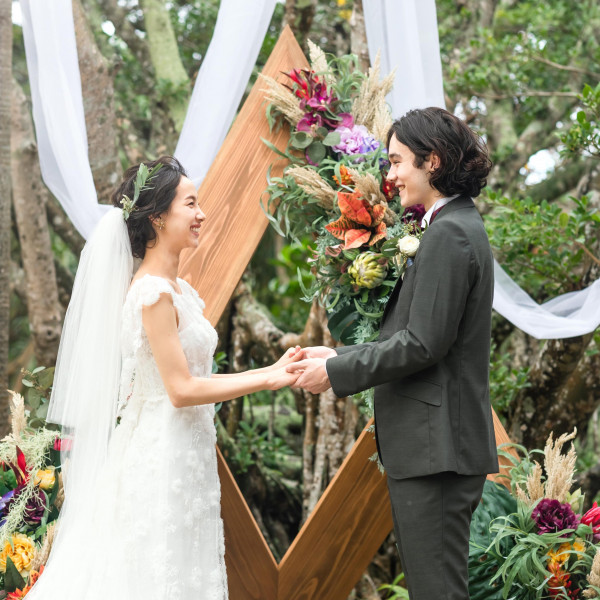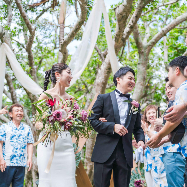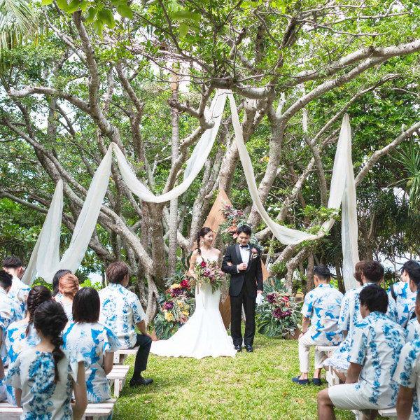 ◆樹々の間から海を望む森がチャペルになる結婚式◆tropicalな緑の中で過ごす、笑顔が似合うセレモニー。ゲストと同じ空気を吸って、同じ景色で過ごす時間こそ、アヤパニ フォレストが選ばれる理由です。