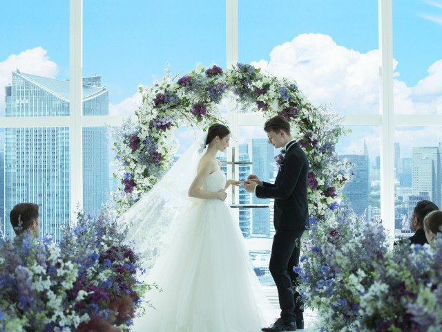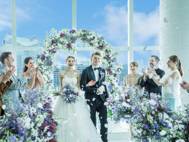 【東京・品川駅すぐ】地上215mの天空チャペル&三ツ星シェフ監修のフレンチ試食を堪能。ガラス一面に広がる絶景が花嫁姿をより美しく引き立てる。専属スタッフがおふたりのご希望に合うプラン・お見積りなどご案内。