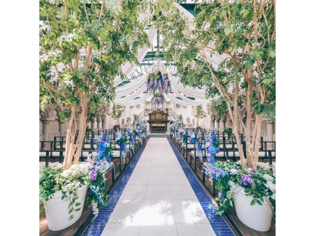 【チャーチ見学】天井から自然光が降り注ぐ透明感のある独立型チャーチ。柔らかな光が樹々を照らし花嫁の美しさを一層引きたてます。入場体験をして挙式当日をイメージして!(※日時により見学できない場合あり)