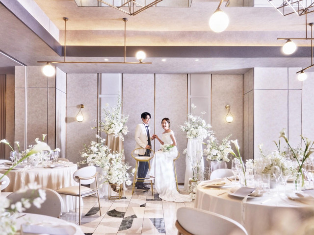 【おふたりが創る大人上質空間】素材やデザインにこだわったシンプルな会場は”おふたりのストーリー”を表現できる空間。貸切だからこそおふたりのテーマに合わせた自由なコーディネートが叶う。