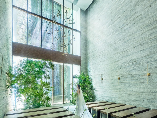 【天井高12m・滝が流れるチャペル】水・石・光の自然を融合させた洗練チャペル。3フロア吹き抜けの天窓から降り注ぐ自然光と滝のせせらぎは屋内ながらも自然感じる神秘的な空間。生演奏が響く感動の挙式をご体感。