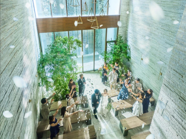 【天井高12m・滝が流れるチャペル】水・石・光の自然を融合させた洗練チャペル。3フロア吹き抜けの天窓から降り注ぐ自然光と滝のせせらぎは屋内ながらも自然感じる神秘的な空間。生演奏が響く感動の挙式をご体感。