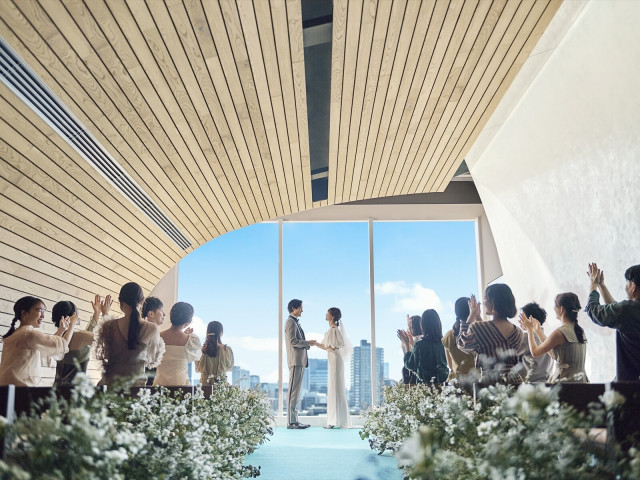 【オリジナル人前式】軽やかなジャズ生演奏・ゲストが奏でるグロウスベル・木製の結婚証明書を使った演出など、大切な人達と一体感を感じる人前式。窓一面に表参道の街並みが広がり、開放感のある空間での感動挙式。